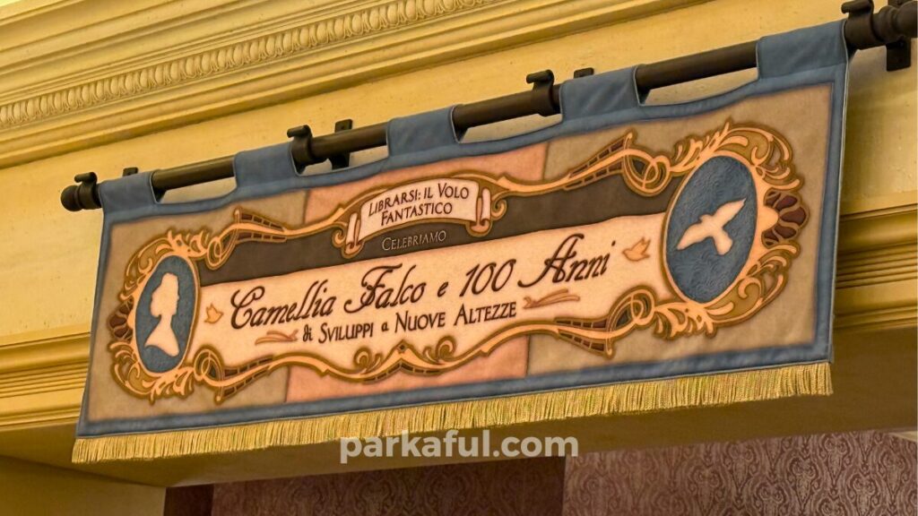 プレショー部屋の入り口には、カメリアの生誕100周年を祝う美しい旗が掲げられています。テキストはイタリア語で、以下のような意味が読み取れます。